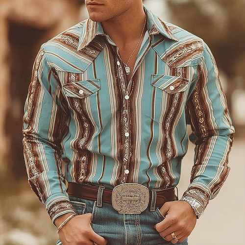 Per uomo Geometrico A righe Color-blocking Camicia Camicia Western Camicia da cowboy Manica Lunga Vintage Retrò All'aperto Quotidiano Abbigliamento da lavoro Autunno Inverno Collo ripiegato Stampa