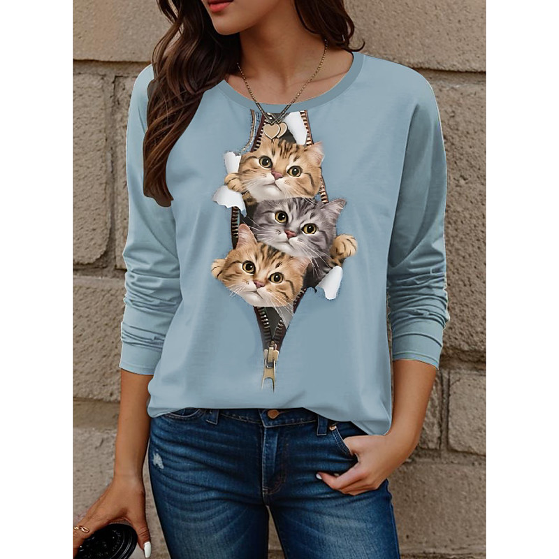 Women's T shirt Crew Neck Long Sleeve Tunic Cat Modern Casual Regular Tops Daily Weekend Print White Yellow Red Blue Dusty Blue Fall Winter