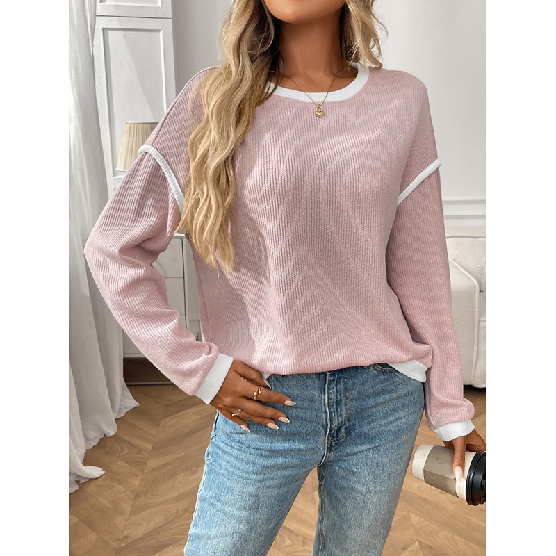 Women's Sweater Casual Soft Pure Color Ribbed Crew Neck Knitted Long Sleeve Regular Tops Knit Outdoor Daily Weekend Black Pink Fall Winter