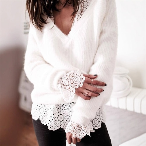 Per donna Felpa Maglione Elegante Moda Carino Tinta unica Scollo a V Pizzo Patchwork Lavorato a maglia Manica Lunga Top Regolari Maglia All'aperto Casa Lavoro Bianco Autunno Inverno