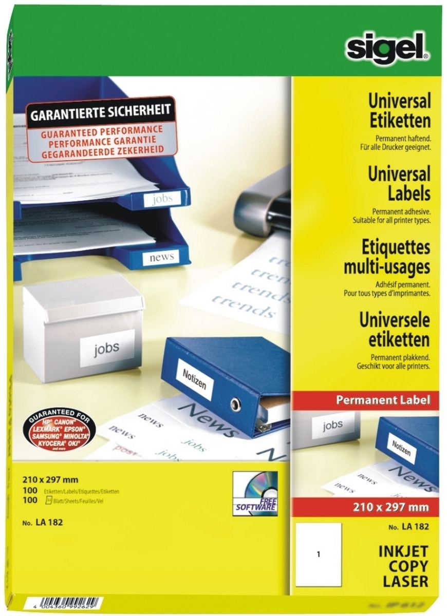 Sigel Etiketten Inkjet/Laser Kopier 210x297mm VE=10x100 Stück (100 Blatt) weiß
