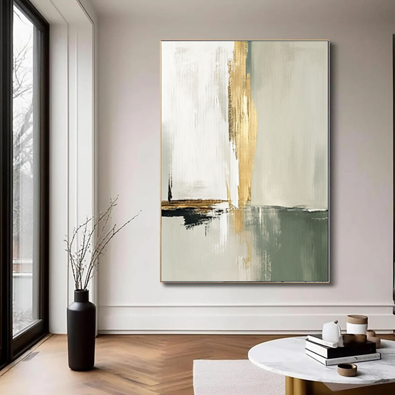 Handmade Green Abstract Wall Art Minimalist Green White Gold Artwork Oil Painting Abstract Poster Green Gold Picture Painting for Home Decor
