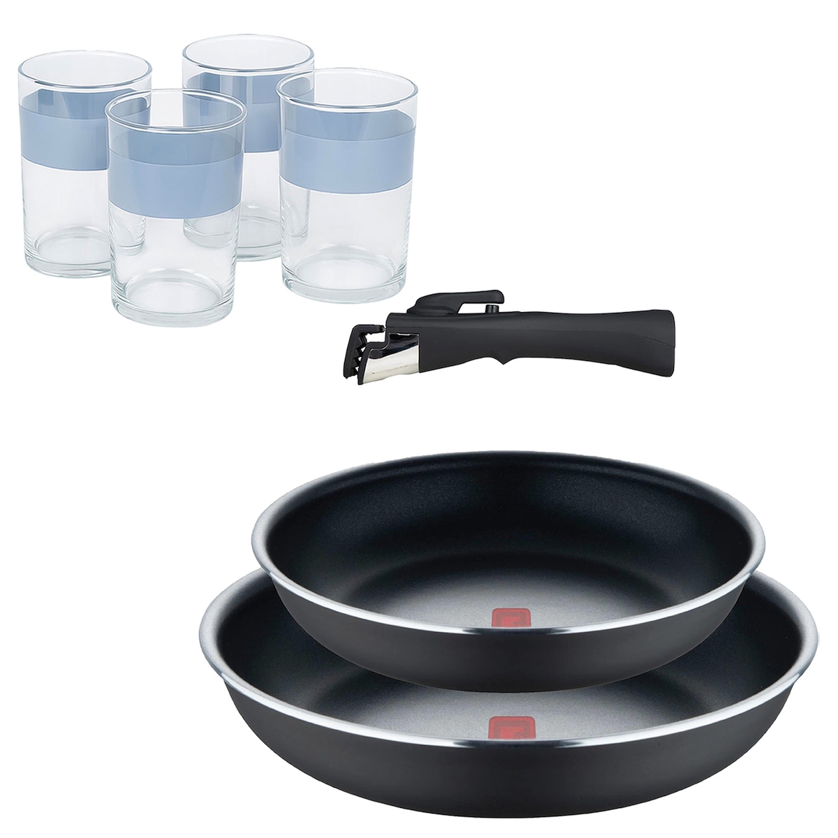 BERGNER - Set mit 2 Bratpfannen Ø24/28cm aus gepresstem Aluminium mit Heat Dot, schwarz, mit abnehmbarem Griff mit 4er-Set Gläser 0,5 L NOIA