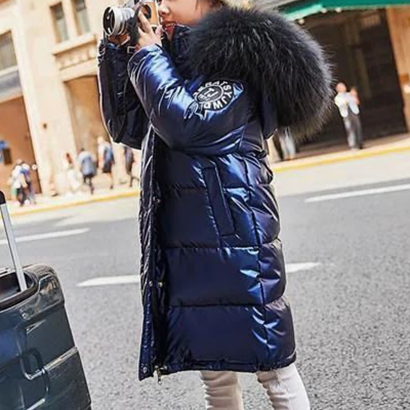 Kids Girls' Down Coat Solid Color Streetwear Fur Trim Zipper Pocket School Coat Outerwear 4-12 Years Winter Black Wine Navy Blue
