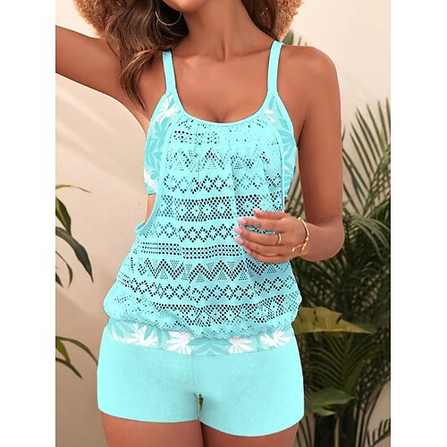 Per donna Tankini Costume da bagno a due pezzi Pizzo Costumi da bagno Tinta unita Costumi da bagno Nero Azzurro cielo Traspirante Asciugatura rapida Leggero Senza maniche - Nuoto Surf Spiaggia Estate