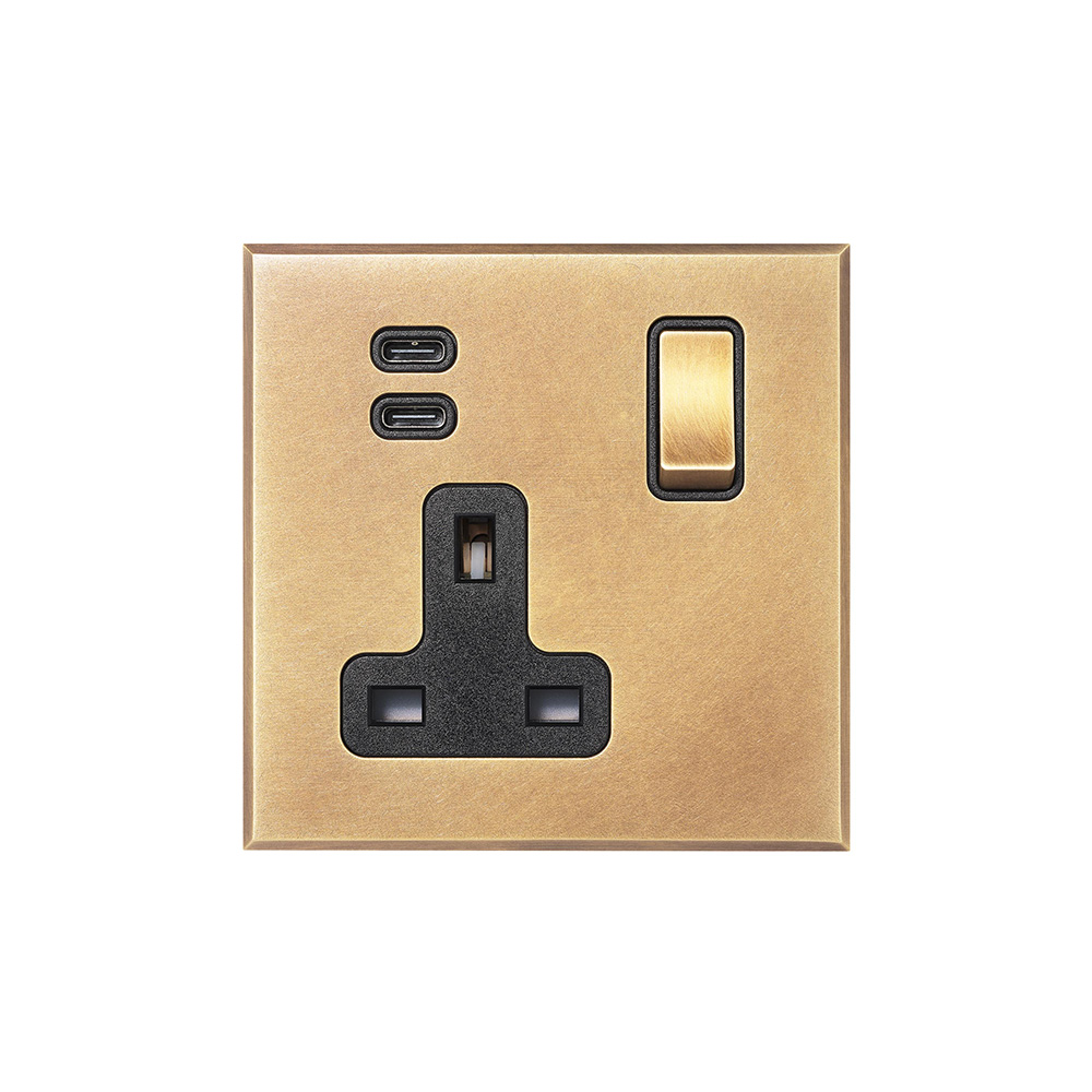 Soho Lighting Natural Brass 1 Gang 13A Double Pole Switched Socket 3.1A Type C+C USB Charging with Black Insert - The Palaces Collection - Size: H 8