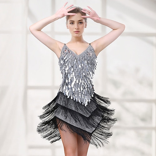 Anni Ruggenti Anni 1920 Anni '30 Lunghezza al ginocchio Abito Flapper Vestito Abiti Cortissima Il grande Gatsby Invitato al matrimonio Frangia con nappe Scollo a V Scollo Tondo Costume Per donna