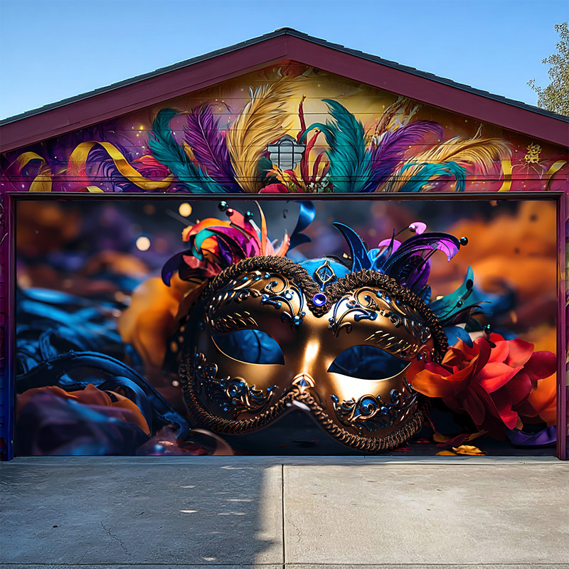 Mardi Gras Garage Door Cover Large Hanging Backdrop Mask Feather Luxury 3D Vibrant Party Outdoor Shooting Backgrounds Front Door Masquerade Home Decor