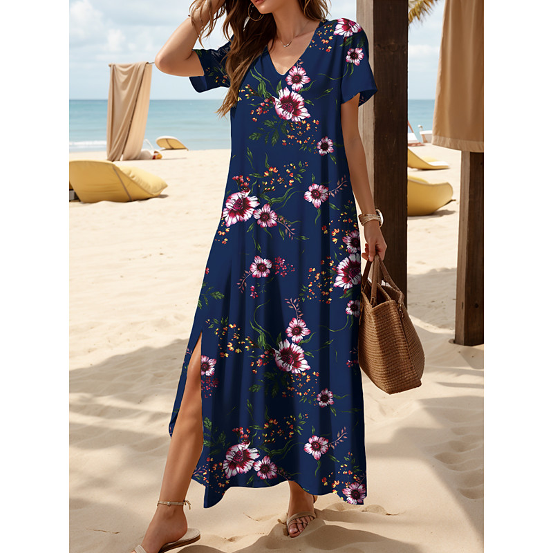 Women's Maxi Dress Knit Dress Casual Dress Sundress A Line Dress Elegant Vacation Casual Beach Regular Fit Floral Graphic Short Sleeve V Neck Blue Dark Brown Red Purple Summer Spring