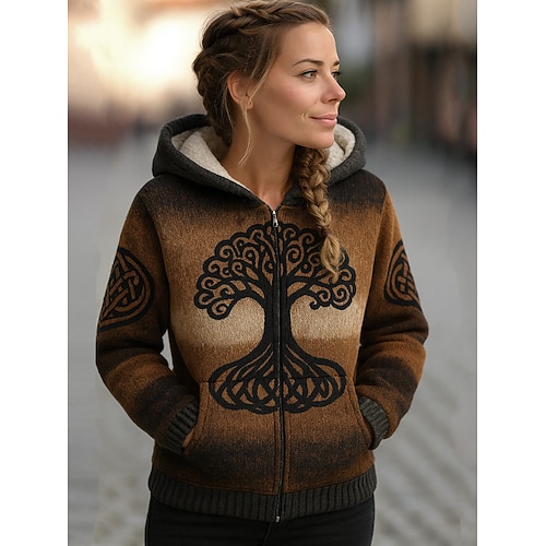 Cappotto invernale da donna in stile vichingo boho, caldo, leggero, con cerniera, stampato, foderato in pile, elegante, vintage, alla moda, geometrico, per casa, lavoro, casual, con cerniera,