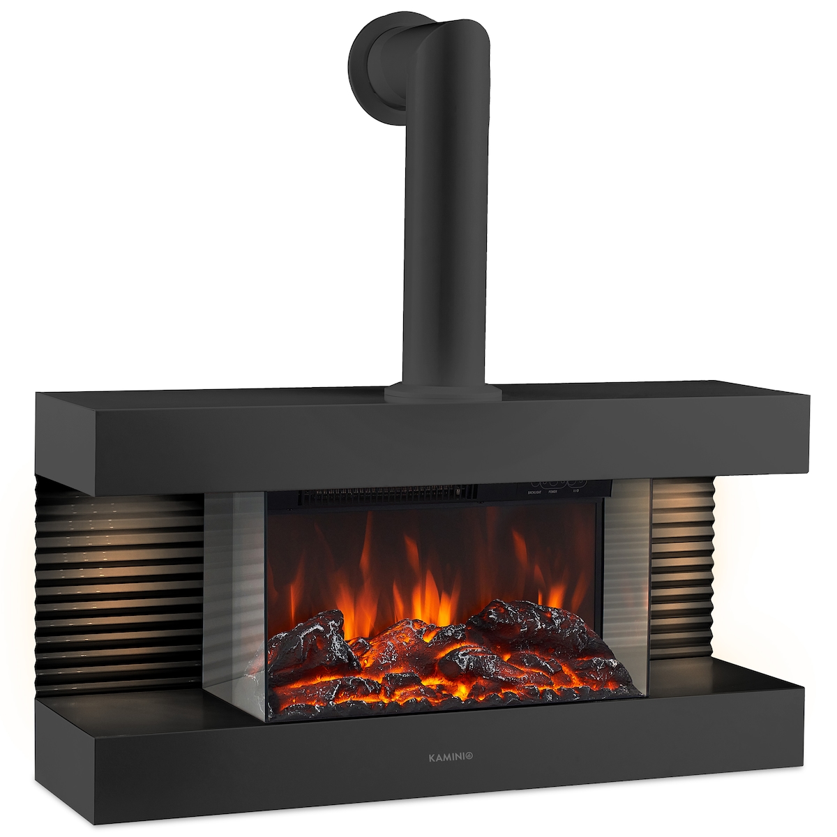 KAMINIO Elektrokamin LIZ mit Ofenrohr - Elektrischer Wandkamin mit Heizung, 3D-Flammeneffekt, LED-Ambientelicht, Fernbedienung - Schwarz