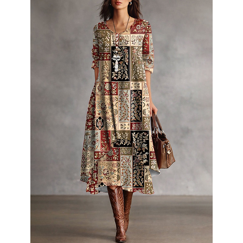 Women's Midi Dress Shift Dress Casual Holiday Loose Fit Graphic Geometric Long Sleeve Crew Neck Yellow Red Purple Khaki Spring Fall Winter
