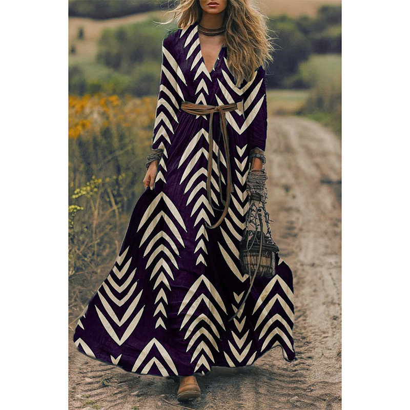 Women's Maxi Dress A Line Dress Pleated Dress Fit And Flare Dress Boho Date Going out Loose Fit Floral Graphic Long Sleeve V Neck Purple Brown Green Spring Fall Winter Autumn