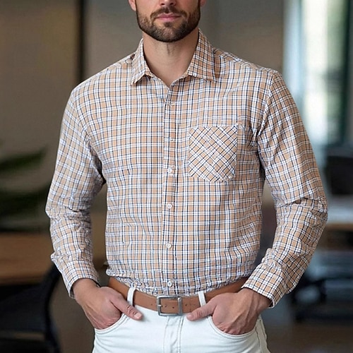 Per uomo Camicia Camicia elegante Camicia con Bottoni Plaid Matrimonio Quotidiano Blu marino Azzurro cielo Kaki Manica Lunga Collo ripiegato Primavera Autunno Abbigliamento Tasca Frontale