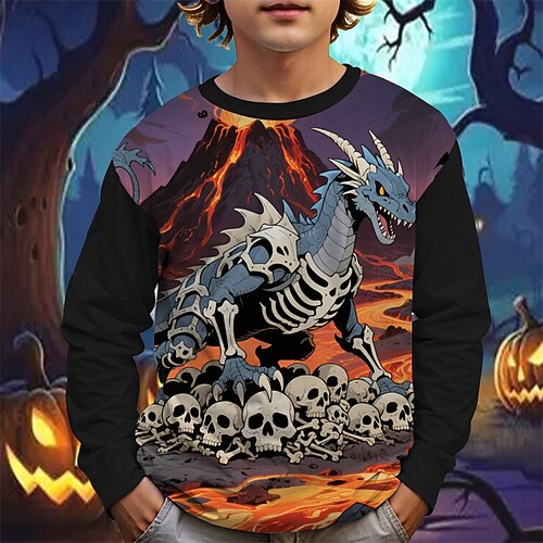 Halloween Jungen 3D Cartoon Schädel Dinosaurier T-Shirt Langarm Frühling Herbst Mode Basic Kinder 4-12 Jahre Rundhalsausschnitt Outdoor Lässig Täglich Normale Passform
