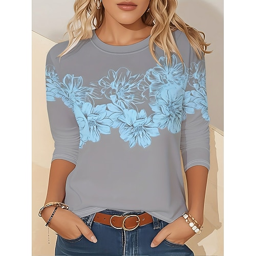 Per donna Maglietta Floreale Grafico Piante Vintage Moda Elegante Manica Lunga Girocollo Top Regolari Quotidiano Weekend Stampato Azzurro Primavera Autunno Inverno