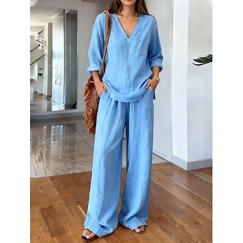 Completo due pezzi basic da donna in 100% cotone, alla moda, streetwear, pantaloni, bolero, top, manica lunga, scollo a V, tinta unita, casual, quotidiano, per attività all'aperto, blu, bianco,