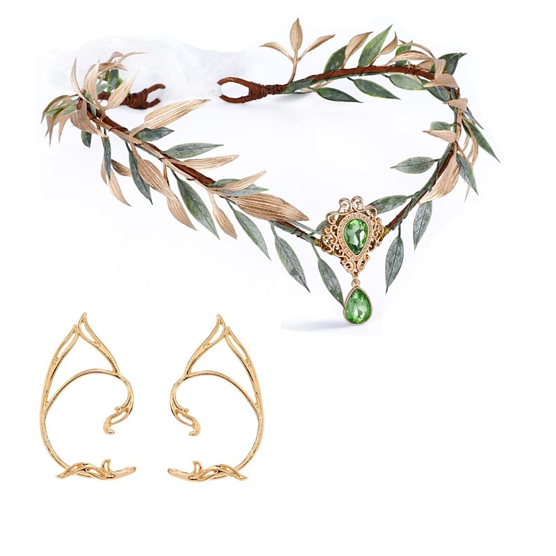 Fairy Leaf Rhinestone Headband and Ear Cuffs Set- Handmade Elf Princess Headpiece Forest Wedding Flower Crown for Women Girls Reneaissance Halloween Cosplay Costume Hair Accessories Photo Props
