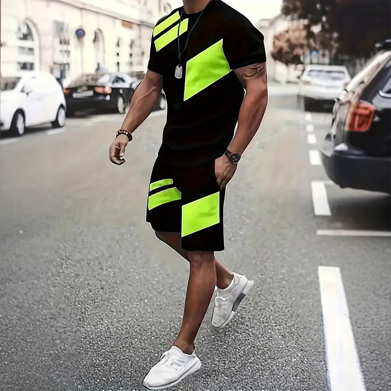 Men's Geometric 2pcs Tees sets Summer Tops Short Sleeve Short Pants Crew Neck Athleisure Sport Casual Daily 3D Print Summer Robin's Egg Blue Grey Green