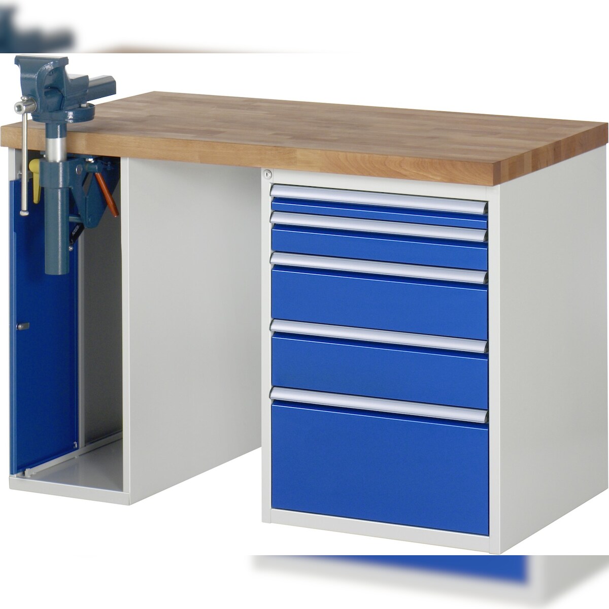 Werkbank, Baukastensystem Serie 7000, 2 Schubladen, 1 Tür, 1 Schraubstock linksseitig, BxT 1250 x 900 mm eurokraft pro