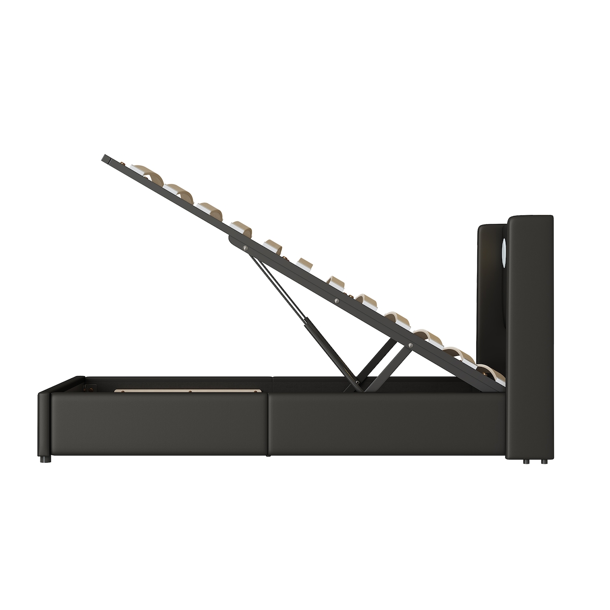 OKWISH PU-Leder Polsterbett 90x200 cm mit Bluetooth-Player, USB-Ladeanschlüssen, LED-Lichtleiste, hydraulischem Stauraum, robustem Metallrahmen Schwarz