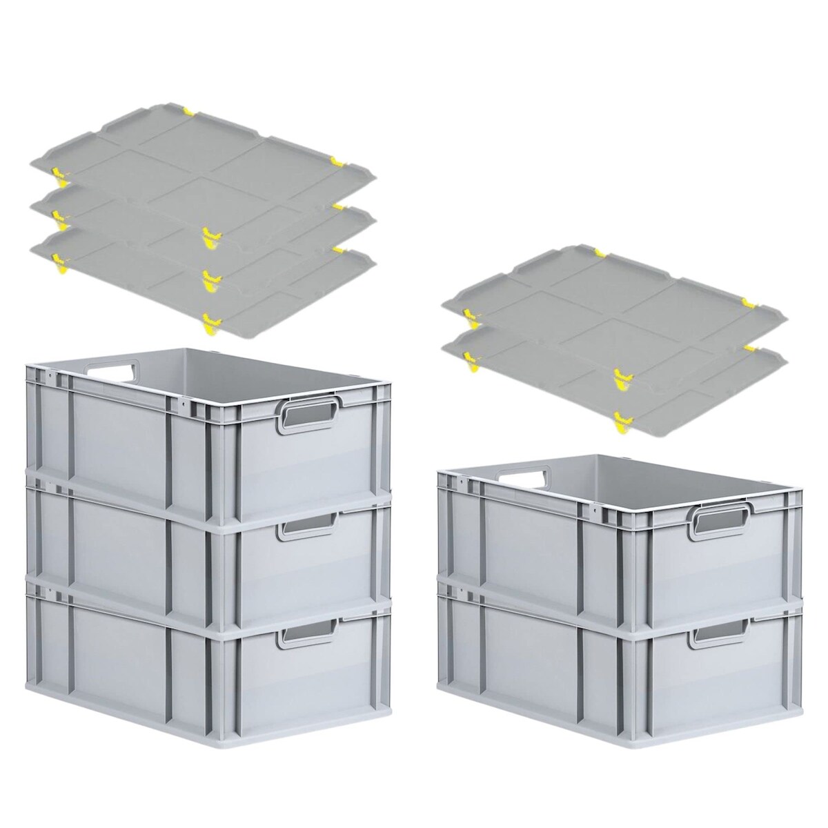 PROREGAL SparSet 5x Eurobox NextGen Economy mit Auflagedeckel & 4x Verschlüsse Gelb, Griffe offen, HxBxT 22x40x60cm, 44L, Eurobehälter, Box