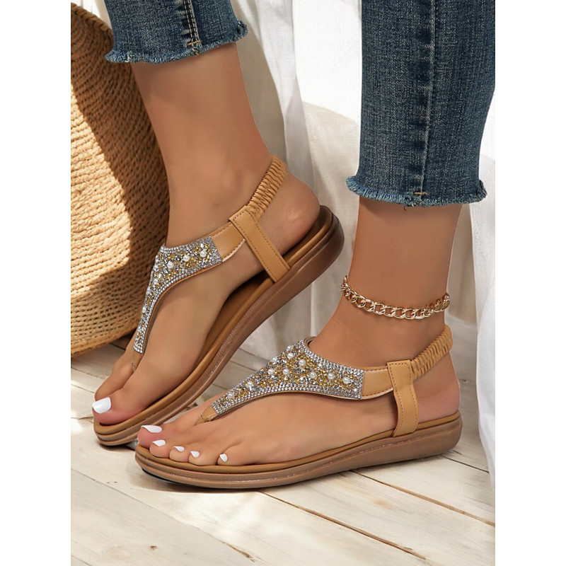 Women's Bohemian Beaded T-Strap Sandals – Vintage Glam Flat Summer Sandals with Rhinestone Embellishments for Beach Casual Wear