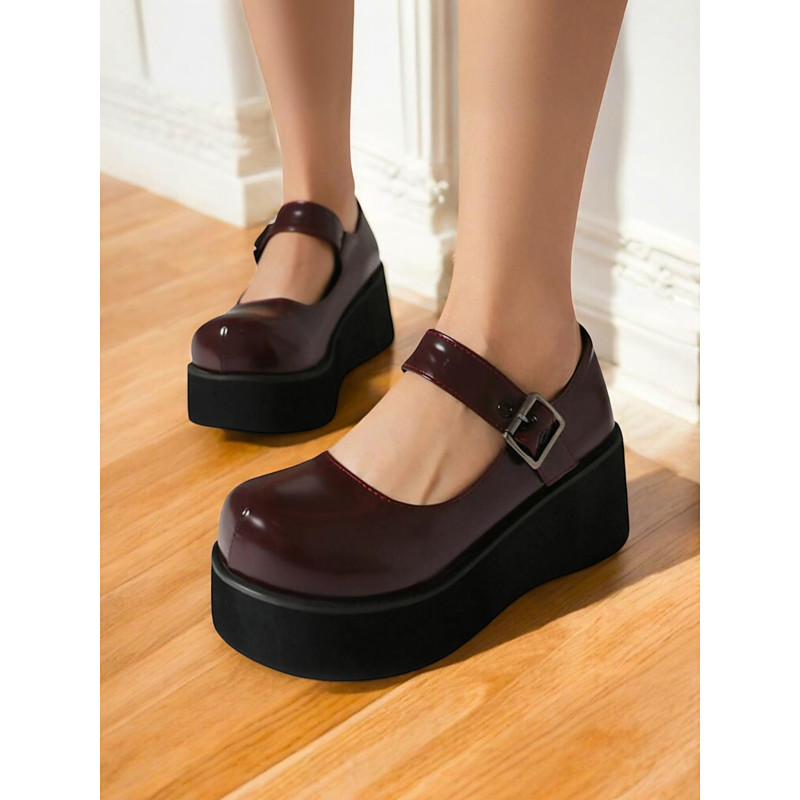 Women's Burgundy Platform Mary Jane Shoes with Buckle Strap, Chunky Retro Flats for Casual Dates and Everyday Wear