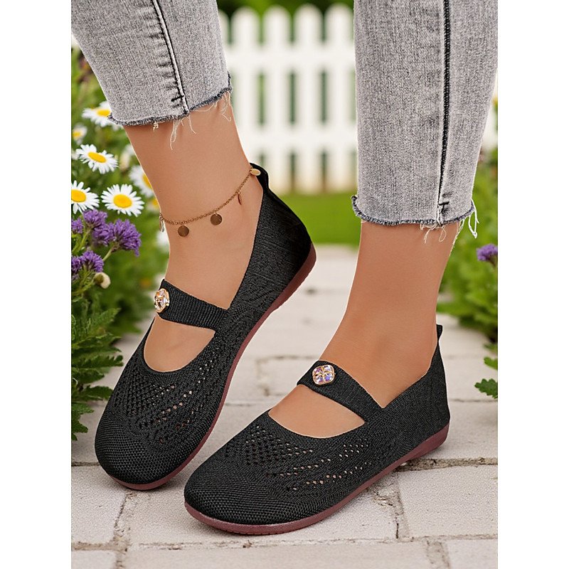 Women's Wide Width Flyknit Mary Jane Flats – Breathable Comfort Shoes with Rhinestone Strap for Walking and Daily Wear