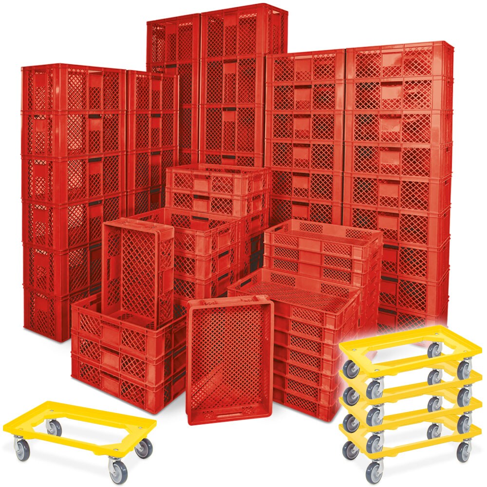 BRB 78 Bäckerkisten in 5 Größen, 600x400 mm, H 90 mm - 410 mm, rot + 5 Roller, gelb