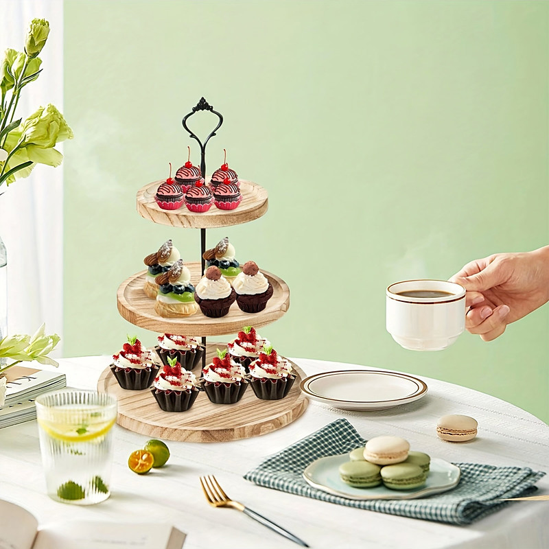 3-Tier Wooden Multi-Layer Cake Stand Solid Wood Wrought Iron High-Leg Tray Dessert Fruit Platter Sweet Treat Display Stand Round Acacia Wood Display Rack Tabletop Decor