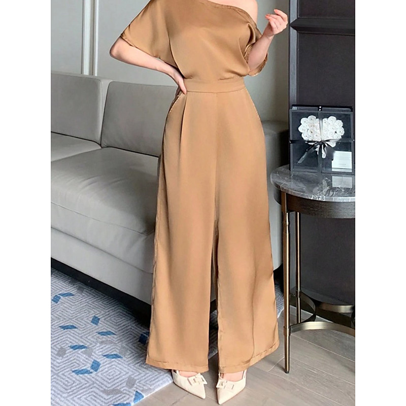 Women's Normal Jumpsuit Elegant Solid Color Short Sleeve Wide Leg Off Shoulder Patchwork Pocket Daily Home Regular Fit Wine Brown Green Summer