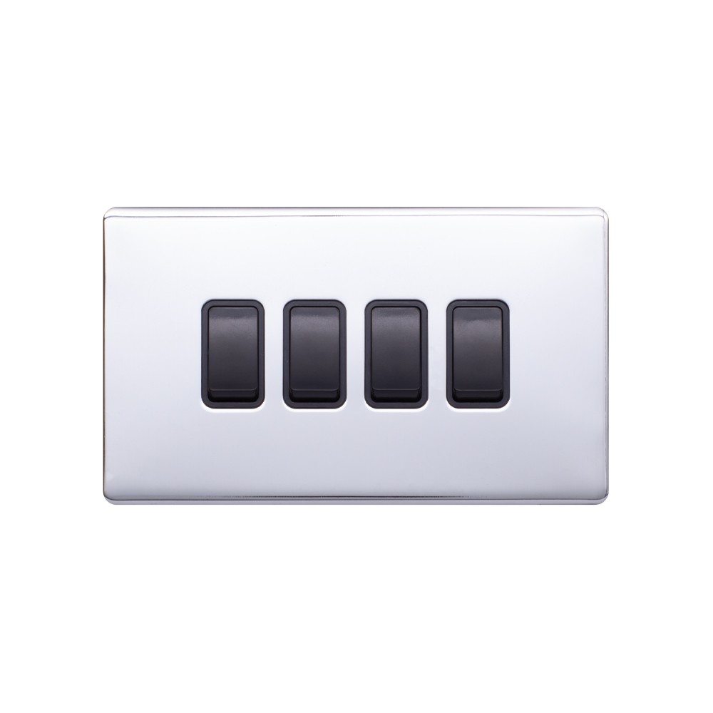 Lieber Polished Chrome 10A 4 Gang 2 Way Switch - Black Insert Screwless - Size: 146mm x 86mm x 2 mm