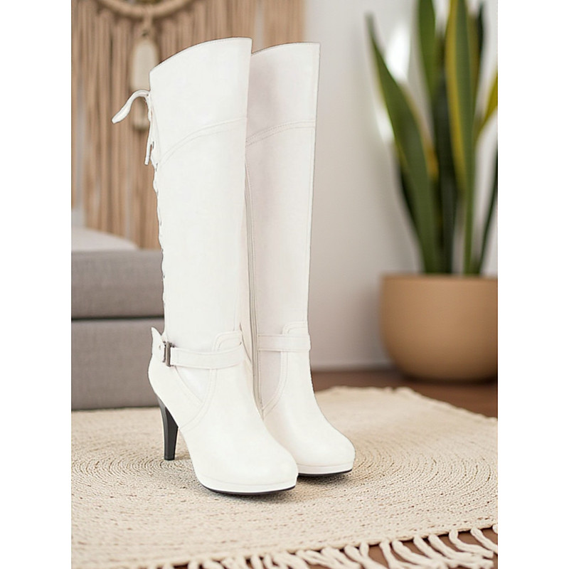 Women's White Knee-High Boots with Double Buckle Detail – Stylish Block Heel Boots for Winter and Casual Outfits