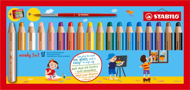 STABILO Multitalent-Stift woody 3 in 1 VE=18 Stück + 1 Spitzer + 1 Pinsel