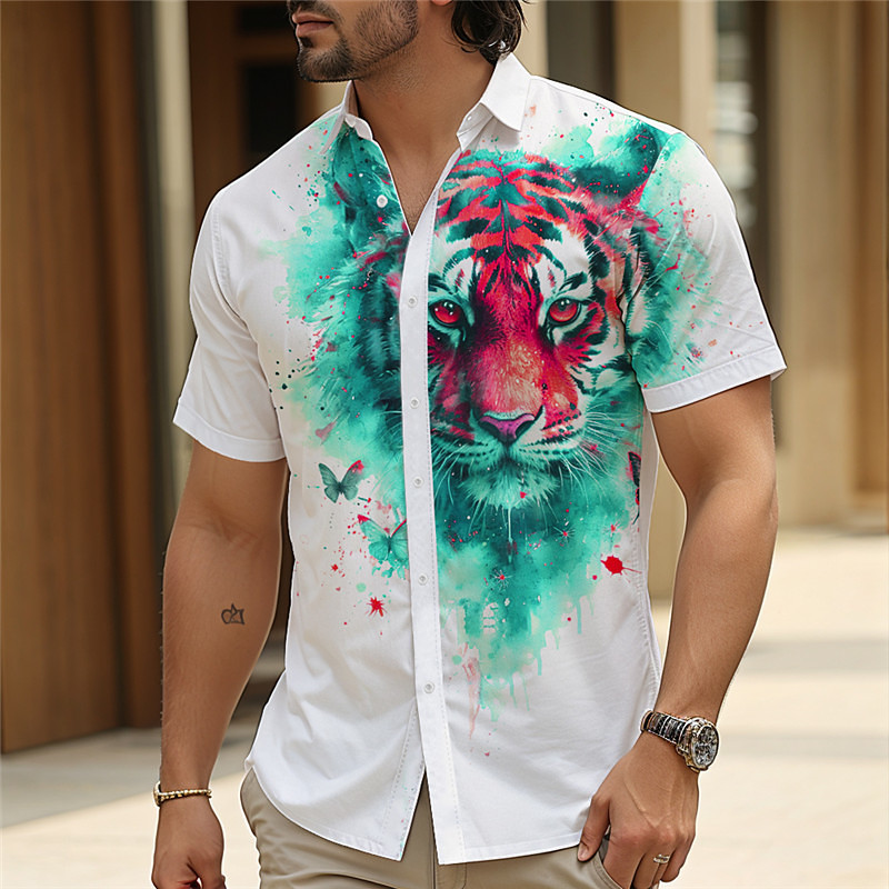 Men's Tiger Button Up Shirt Short Sleeve Vacation Hawaiian Resort Style Outdoor Casual Daily Summer All Seasons Button Up 3D Print Yellow Blue Green
