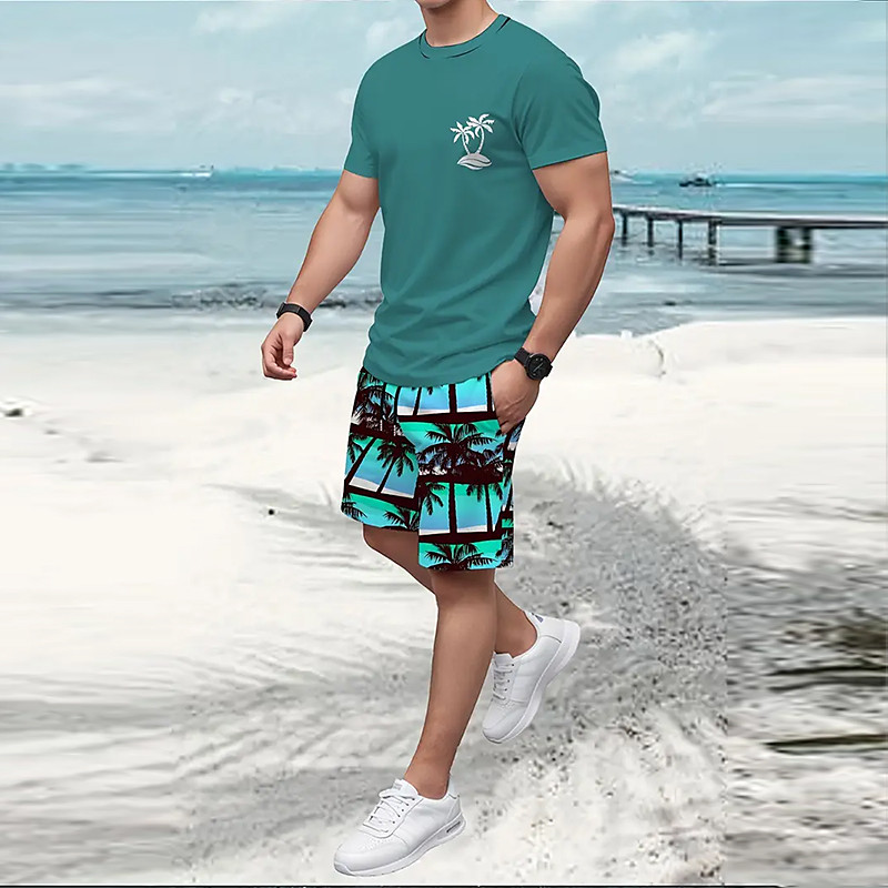 Men's Palm Tree 2pcs Tees sets Summer Tops Short Sleeve Short Pants Crew Neck Vacation Casual Daily Beach Vacation Wear 3D Print Summer Green