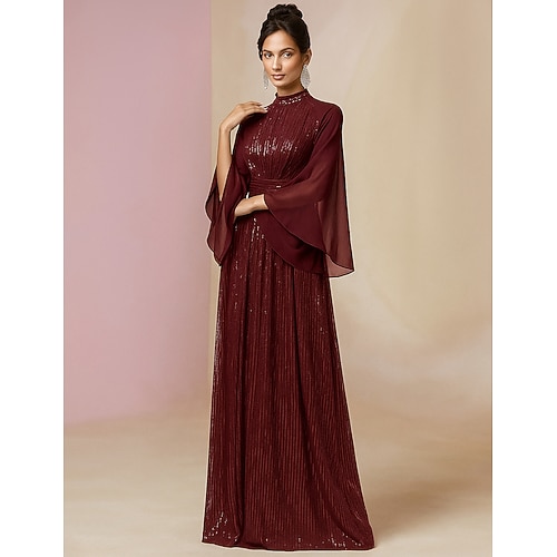 Abito da Invitata al Matrimonio A-Line Lunghezza Piena Abiti Formali Abito da Gala Serale Abito per Madre della Sposa Maniche Lunghe Collo Alto Elegante Vintage Brillante e Splendente Spandex con