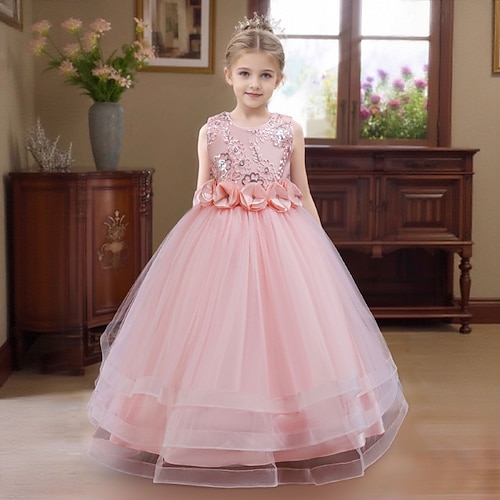 Abito da damigella d'onore bambina Ragazze Abito formale Abiti da sposa Feste Matrimonio Formale Moda Adorabile Principessa Patchwork Rete Floreale Senza Maniche Girocollo Rosa Rosso Dai 4 anni in su