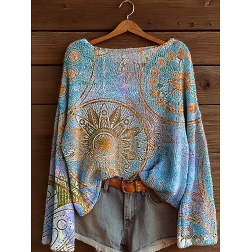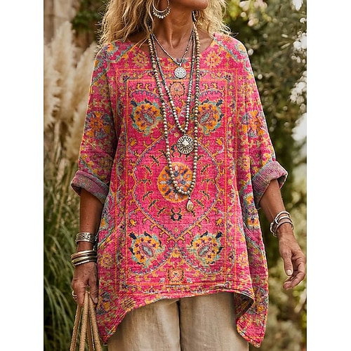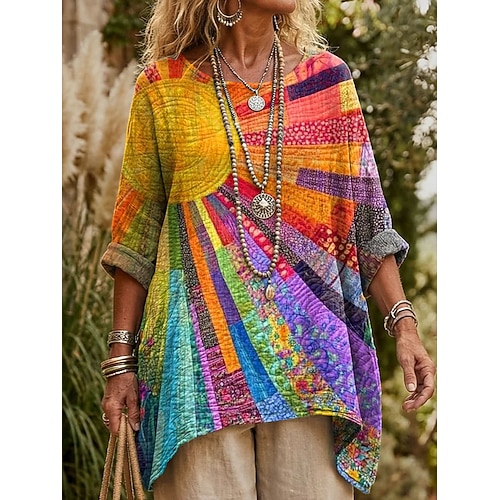 Damen Hemd Bluse Bohemien Vintage Täglich Dreiviertelarm U-Boot-Ausschnitt Normale Oberteile Ausgehen Druck Weiß Gelb Rote Orange Grün Sommer Frühling Herbst