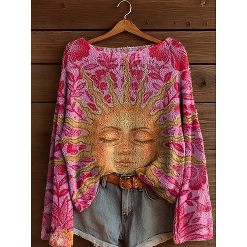 Damen Pullover Lässig Weich Blumen Grafik Gerippt U-Boot-Ausschnitt Gestrickt Druck Langarm Normale Oberteile Stricken Outdoor Täglich Wochenende Rosa Rote Frühling Herbst