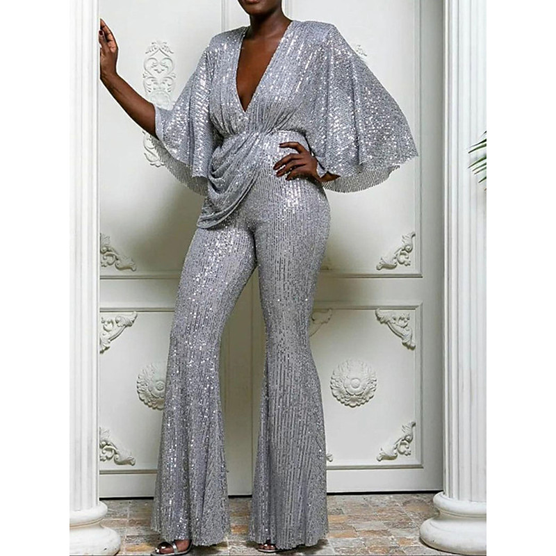 Women's Jumpsuit High Waist Sequin Sparkly Solid Color V Neck Elegant Wedding Party Disco Regular Fit 3/4 Length Sleeve Silver S M L Fall
