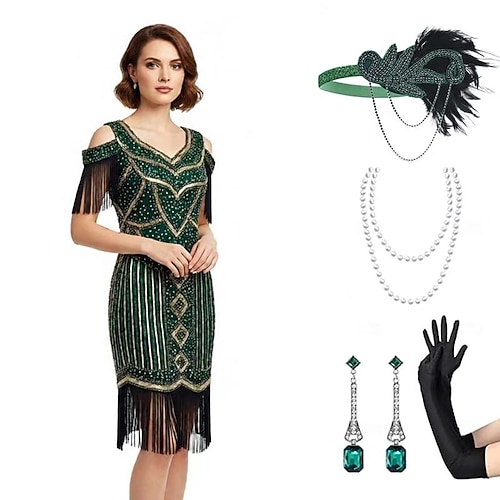 Set Goldene Zwanziger 1920er Knielang Kleid Flapper Kleid Outfits mit Zubehör Kalter Schulter-Ärmel Kurze Ärmel Der große Gatsby Charleston Pailletten Quastenfransen Feder V Ausschnitt Kostüm Damen