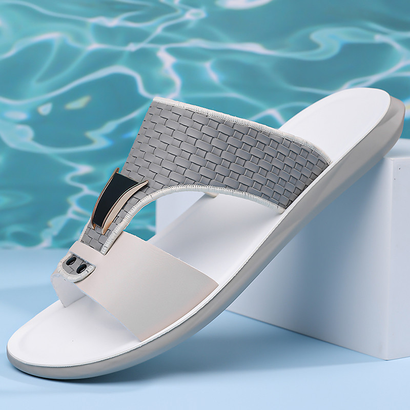 Men's Faux Leather Beach Sandals – Stylish Black Slides with Adjustable Strap for Comfort
