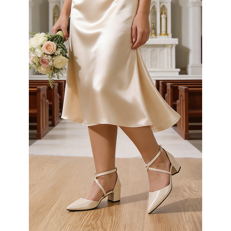 Champagne Satin Closed-Toe Dance Shoes with Cross-Strap Design for Women - Ideal for Ballroom and Social Dancing