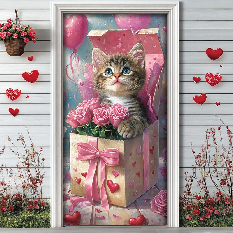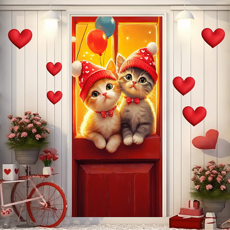 Valentine's Day Outdoor Decorations Door Covers Door Tapestry Door Curtain Decoration Backdrop Indoor/Outdoor Door Banner for Front Door Farmhouse Cats Couple