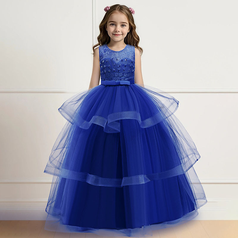 Flower Girl Dress Girls' Formal Dress Wedding Attire Party Wedding Formal Adorable Formal Princess Hollow Out Mesh Solid Color Sleeveless Crew Neck Blue Pink 4 years