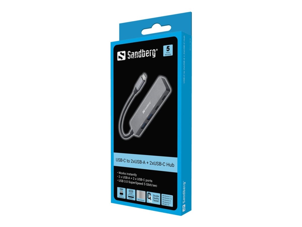 Sandberg USB-C to 2xUSB-A + 2xUSB-C Hub, USB Typ-C, USB 3.2 Gen 1 (3.1 Gen 1) Type-A, USB 3.2 Gen 1 (3.1 Gen 1) Type-C, 5000 Mbit/s, Grau, Aluminium, Rundkabel