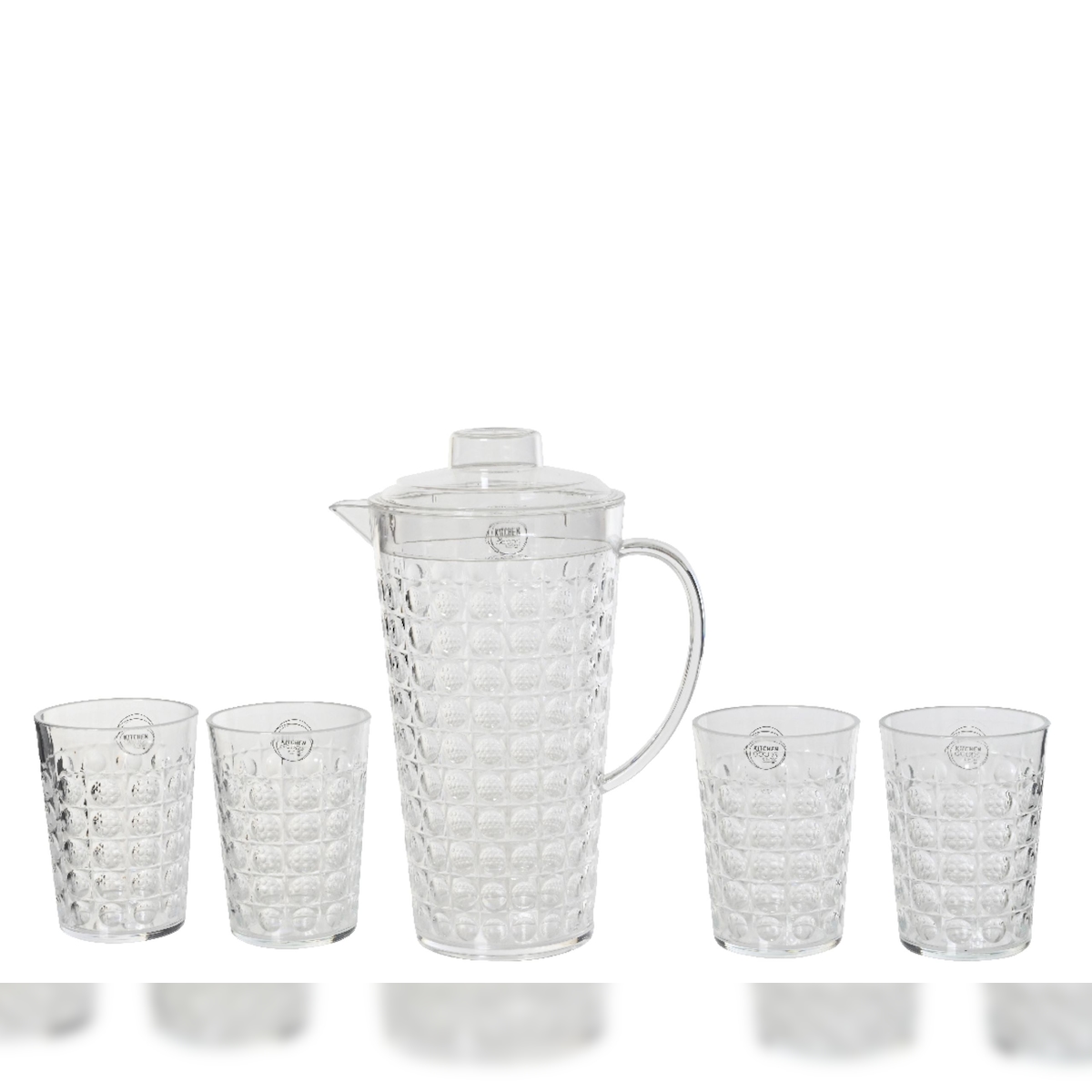 Decoris 4 Trinkgläser mit Kanne Kunststoff Trinkgeschirr Gläser Krug Gläserset Karaffe Trinkbecher Wassergläser Saftgläser Limonadengläser Transparent