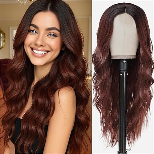kastanienbraune mittellange Perücken für Frauen, 18 Zoll Mittelscheitel, gewellte Perücke aus Kunsthaar – Perücke mit natürlichem Haaransatz für den täglichen Gebrauch bei Partys/Halloween
